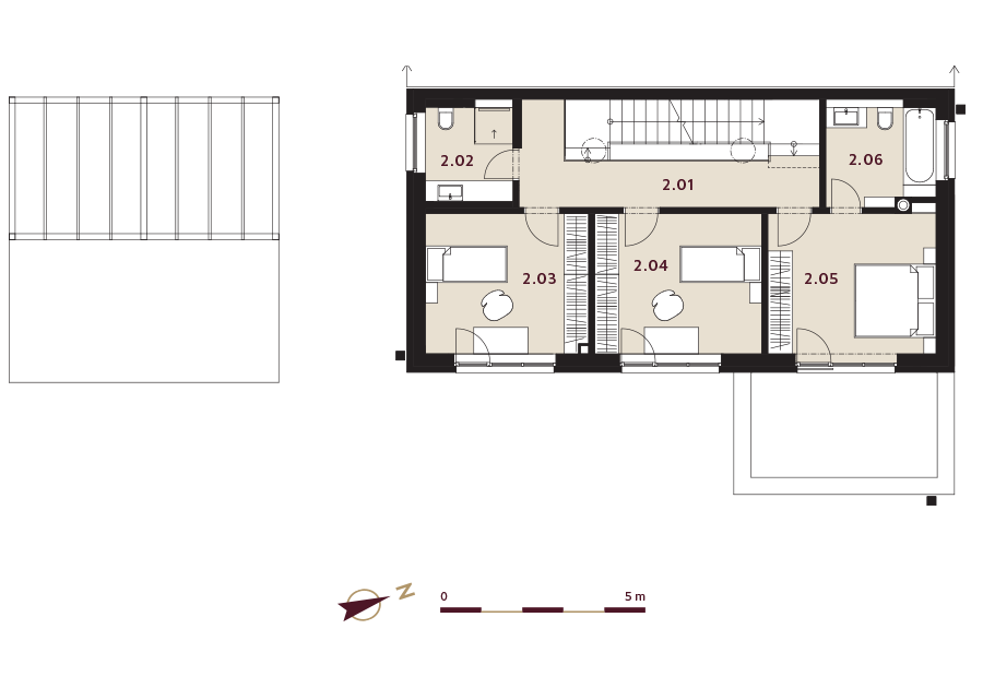 Vyobrazené vybavení a zařízení v plánech domů (nábytek, kuchyňská linka, spotřebiče, vestavěné skříně, atd.), stejně jako markýzy nejsou součástí dodávky. Rozsah dodávky je specifikován ve standardech bytu. Investor si vyhrazuje právo na změnu.